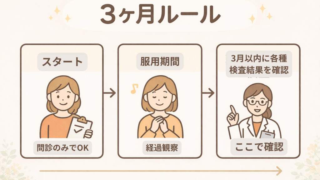 もし3ヶ月を過ぎても検査結果の提出がない場合は、患者様の安全を守るため、処方を一時ストップさせていただきます。(※事前のご案内あり)